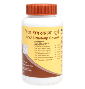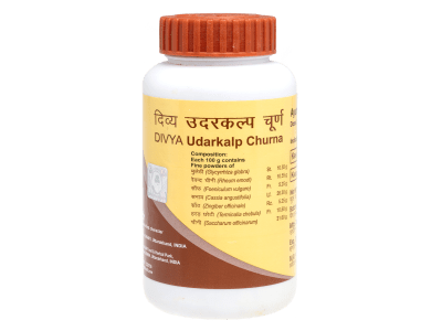 Divya Udarkalp Churna contains Madhu-yashti (Mulethi), Mishreya (Saunf), Swarna-patri (Sanay), Revana-chini, Shata-patri (rose-flower), Haritaki (Jangh Harad), and Misri (sugar-candy) as active ingredients.