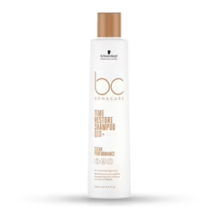 Bonacure Time Restore formula enriched with Q10+ co-enzyme is essential for the vitalisation of cells, stimulating the hair bulb to re-activate production of the 2 keratins that decrease over time and therefore restoring the optimal structure of future hair growth. Bonacure Time Restore Shampoo gently cleansing shampoo for mature hair. Formulated with sugar tensides to very gently cleanse hair and scalp. Formula with Q10 and cationic Cell Equalizer action deeply nourish the inner structure and smooth the surface of each strand while unruly hair is tamed, to feel soft and look shiny for longer.